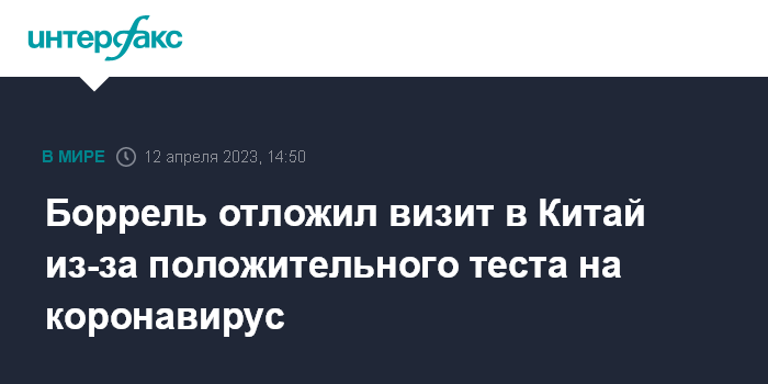 Москва. 12 апреля. INTERFAX.RU - Высокий представитель Евросоюза по иностранным делам Жозеп Боррель объявил о переносе своего визита в Китай в связи с положительным тестом на COVID-19.