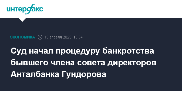 Москва. 13 апреля. INTERFAX.RU - Арбитражный суд Москвы 10 апреля признал обоснованным заявление Агентства по страхованию вкладов (АСВ, конкурсный управляющий) о банкротстве бывшего члена совета директоров Анталбанка Сергея Гундорова.