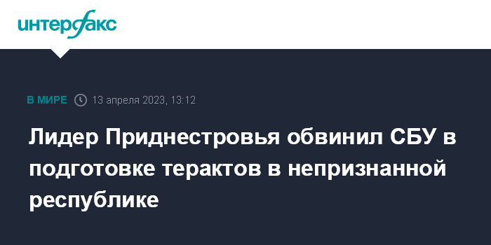 Москва. 13 апреля. INTERFAX.RU - Лидер непризнанной Приднестровской Молдавской Республики Вадим Красносельский заявил, что теракты, которые были предотвращены в Приднестровье, готовила Служба безопасности Украины.