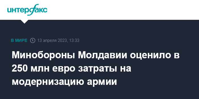 Москва. 13 апреля. INTERFAX.RU - Модернизация вооруженных сил Молдавии обойдется в 250 млн евро, сказал журналистам госсекретарь Министерства обороны страны Валерий Мижа после слушаний в парламенте об обеспечении нацбезопасности.