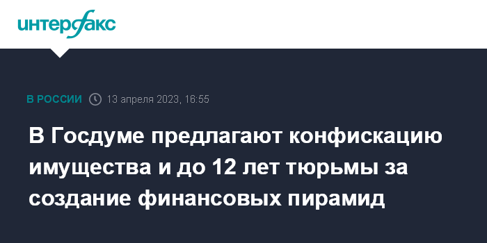 Москва. 13 апреля. INTERFAX.RU - Депутаты Госдумы подготовили законопроект, который вводит в Уголовный кодекс (УК) РФ определение "финансовая (инвестиционная) пирамида", за ее создание можно будет получить до 12 лет тюрьмы с конфискацией имущества, предлагается также ввести уголовную ответственность за рекламу финансовых пирамид, сообщил "Интерфаксу" источник, знакомый с ходом подготовки законопроекта.