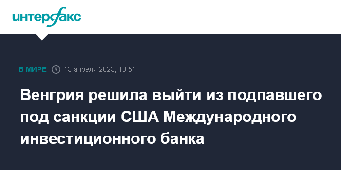 Москва. 13 апреля. INTERFAX.RU - Власти Венгрии решили прекратить участие в работе Международного инвестиционного банка (МИБ), ранее в апреле подпавшего под санкции США, сообщает в четверг агентство EFE.