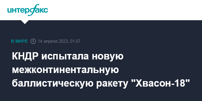 Москва. 14 апреля. INTERFAX.RU - КНДР заявила, что испытала новую межконтинентальную баллистическую ракету "Хвасон-18", сообщает южнокорейское агентство "Ренхап" со ссылкой на северокорейские официальные СМИ.