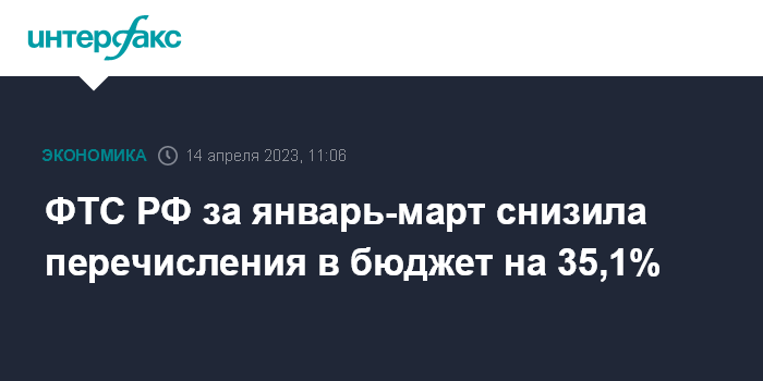 Москва. 14 апреля. INTERFAX.RU - Федеральная таможенная служба (ФТС) РФ за январь-март 2023 года перечислила в федеральный бюджет 1 трлн 288,1 млрд рублей, что на 35,1% меньше, чем за аналогичный период 2022 года (1 трлн 983,7 млрд рублей), следует из опубликованных в пятницу данных таможенной службы.