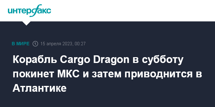 Москва. 15 апреля. INTERFAX.RU - Многоразовый корабль Cargo Dragon американской компании SpaceX в субботу расстыкуется с Международной космической станцией (МКС), сообщает Национальное управление по аэронавтике и исследованию космического пространства США (NASA).