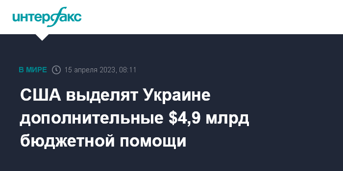 Москва. 15 апреля. INTERFAX.RU - Американские власти предоставят Украине $4,9 млрд бюджетной помощи через механизмы Всемирного банка, сообщает госдепартамент.