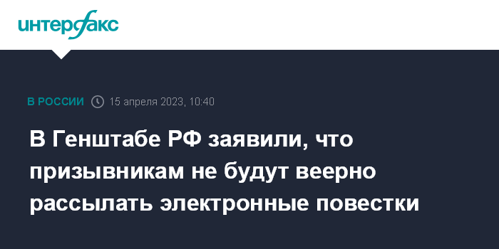 Москва. 15 апреля. INTERFAX.RU - В Генштабе РФ заявили об отсутствии планов проводить массовые рассылки "электронных повесток" гражданам призывного возраста.