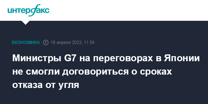 Москва. 16 апреля. INTERFAX.RU - Министрам энергетики, окружающей среды стран G7, собравшимся в Саппоро (Япония), после двух дней переговоров не удалось установить срок отказа от использования угля при производстве энергии, сообщает в воскресенье Kyodo.