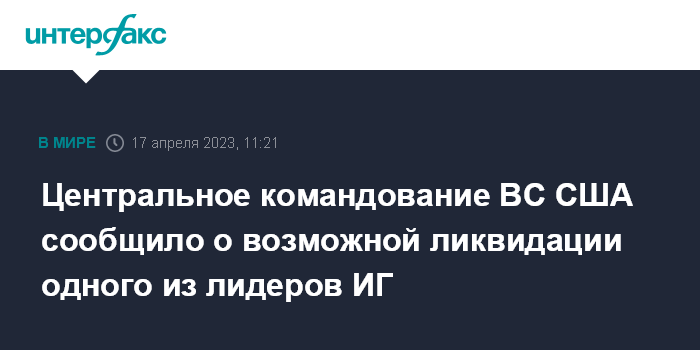 Москва. 17 апреля. INTERFAX.RU - Одного из лидеров террористической группировки "Исламское государство" (ИГ, запрещена в РФ) в Сирии, вероятно, ликвидировали в ходе атаки американских военных, сообщает в понедельник Центральное командование Вооруженных сил США.