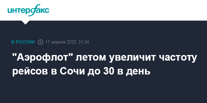 Москва. 17 апреля. INTERFAX.RU - Группа "Аэрофлот" сообщила, что летом увеличит частоту полетов в Сочи из 12 городов России и будет выполнять более 30 рейсов в день.