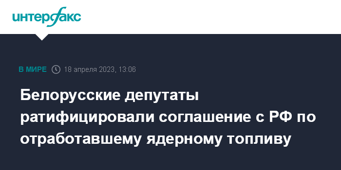 Москва. 18 апреля. INTERFAX.RU - Депутаты Палаты представителей Национального собрания Белоруссии одобрили во вторник законопроект "О ратификации Соглашения между правительством Республики Беларусь и правительством Российской Федерации о сотрудничестве в области обращения с отработавшим ядерным топливом" (ОЯТ).