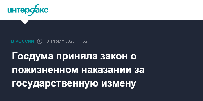 Закон вводит пожизненное наказание за государственную измену. В настоящее время статья 275 Уголовного кодекса РФ предусматривает за госизмену наказание в виде лишения свободы на срок от 12 до 20 лет со штрафом в размере до 500 тысяч руб.