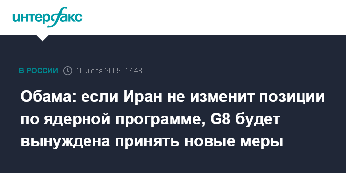 Москва. 10 июля. INTERFAX.RU - Лидеры "группы восьми" в послании к Ирану предупреждают, что отказ Тегерана изменить позицию по развитию ядерной программы до сентября вынудит "восьмерку" принять новые меры, заявил на пресс-конференции в Аквиле президент США Барак Обама.
