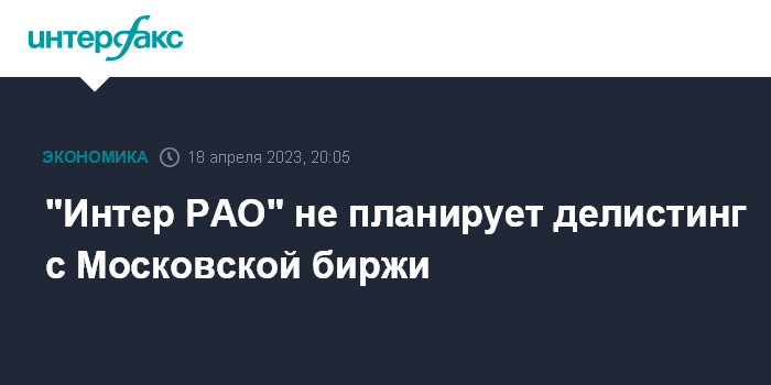 Москва. 18 апреля. INTERFAX.RU - Делистинг с Московской биржи не входит в планы ПАО "Интер РАО", этот вопрос не обсуждается, говорится в годовом отчете компании.