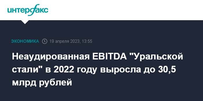 Москва. 19 апреля. INTERFAX.RU - Неаудированная EBITDA "Уральской стали" в 2022 году выросла в полтора раза, до 30,5 млрд рублей, сообщила компания в презентации.