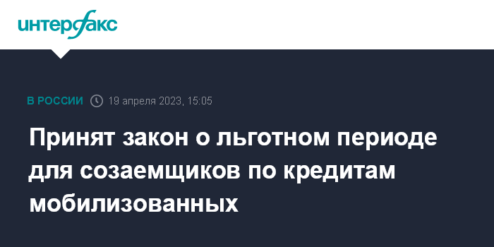 Москва. 19 апреля. INTERFAX.RU - Госдума приняла в третьем чтении закон, который позволяет созаемщикам по кредитам мобилизованных граждан претендовать на предоставление льготного периода, даже если они не являются членом семьи мобилизованного.