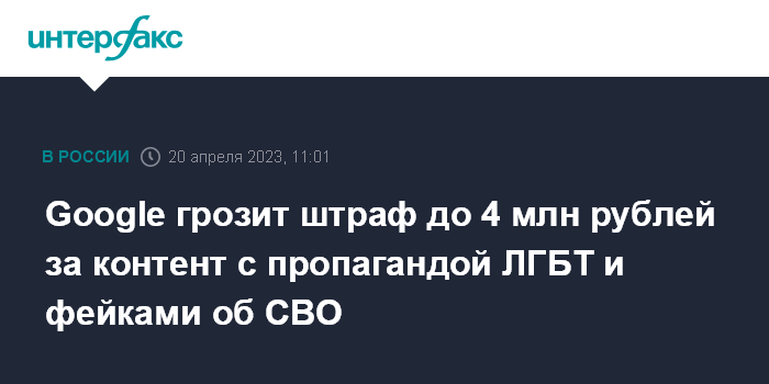 Google грозит штраф до 4 млн рублей за контент с пропагандой ЛГБТ и фейками об СВО