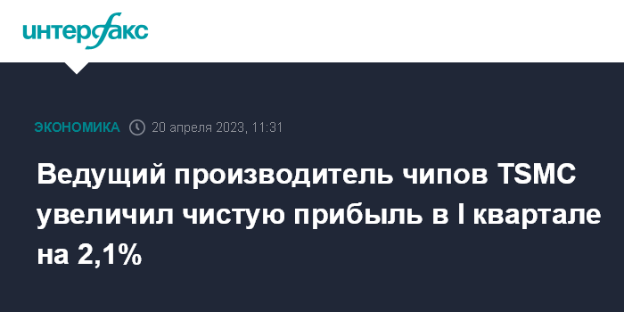 Москва. 20 апреля. INTERFAX.RU - Ведущий мировой производитель микросхем на заказ Taiwan Semiconductor Manufacturing Co (TSMC) увеличил чистую прибыль в первом квартале 2023 года на 2,1% по сравнению с тем же периодом прошлого года.