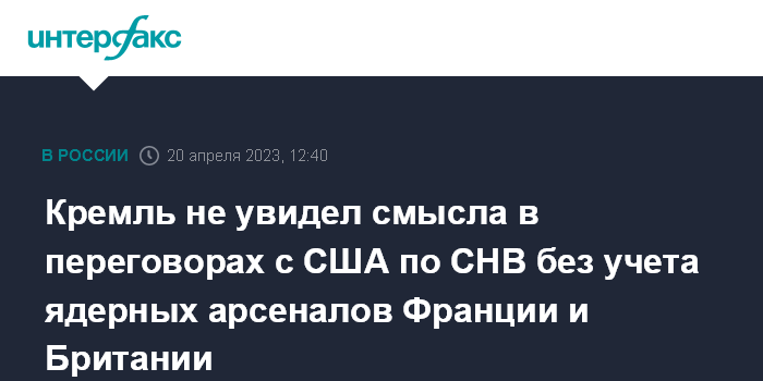 Москва. 20 апреля. INTERFAX.RU - Вести переговоры по контролю над стратегическими вооружениями с США бессмысленно без учета ядерных арсеналов Франции и Великобритании, которые де-факто контролируются Вашингтоном, заявил пресс-секретарь президента РФ Дмитрий Песков.