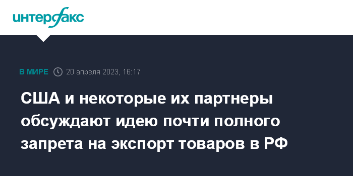 Москва. 20 апреля. INTERFAX.RU - США и некоторые другие союзники Украины обсуждают план, предусматривающий почти полный запрет на экспорт в Россию, сообщает в четверг Bloomberg со ссылкой на источники.