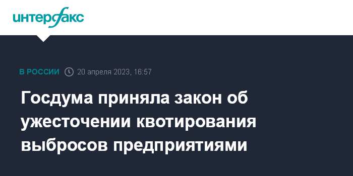 Москва. 20 апреля. INTERFAX.RU - Госдума приняла во втором и третьем чтении закон, который исключает для промышленных предприятий возможность проводить компенсационные мероприятия по улучшению качества атмосферного воздуха в городах, которые вошли в эксперимент по квотированию выбросов.