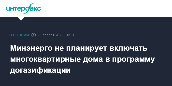 Москва. 20 апреля. INTERFAX.RU - Минэнерго РФ не планирует вносить изменения в федеральную программу догазификации с тем, чтобы включить в перечень газифицируемых объектов многоквартирные дома (МКД).