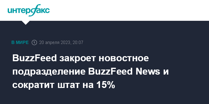 Москва. 20 апреля. INTERFAX.RU - Американская интернет-компания BuzzFeed Inc. объявила о закрытии новостного подразделения Buzzfeed News, а также анонсировала сокращение штата на 15% и отставку двух топ-менеджеров.