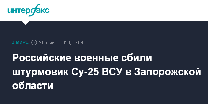 Москва. 21 апреля. INTERFAX.RU - Российским комплексом противовоздушной обороны (ПВО) сбит украинский штурмовик Су-25 в районе села Щербаки Запорожской области, заявил начальник пресс-центра группировки "Восток" Александр Гордеев.