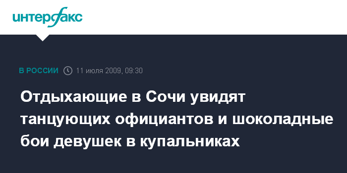 Сочи. 11 июля. ИНТЕРФАКС-ЮГ - Организаторы развлечений и отдыха Сочи готовят на весь сезон развлекательную программу для гостей и жителей курорта с танцующими официантками и девушками, дерущимися шоколадом.