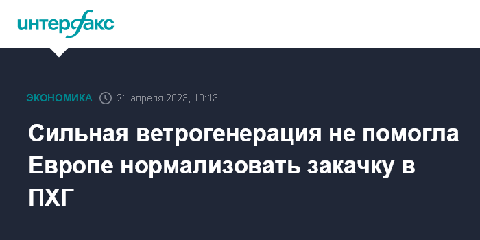 Москва. 21 апреля. INTERFAX.RU - Всплеск выработки ветрогенерации в Европе 19 апреля, когда ветряки обеспечили 126% потребностей Германии в электроэнергии, а спотовая цена на электроэнергию какое-то время была отрицательной, не помог исправить ситуацию с закачкой газа в ПХГ региона. В тот день уровень инъекций все равно был на треть ниже стандартного для этого периода за предыдущие годы.