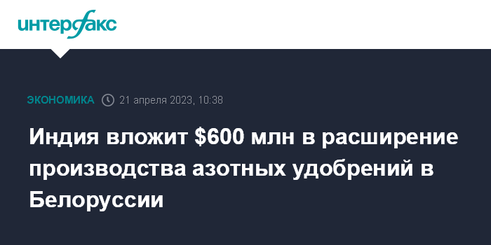 Москва. 21 апреля. INTERFAX.RU - Индийские компании планируют инвестировать до $600 млн в расширение производства азотных удобрений на ОАО "Гродно Азот" в Белоруссии для увеличения объема поставок в Индию, говорится в мониторинге Евразийского банка развития (ЕАБР) "Инфраструктура в Евразии".
