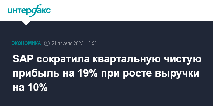 Москва. 21 апреля. INTERFAX.RU - Германская SAP SE, крупнейший мировой производитель программного обеспечения для управления предприятиями, в первом квартале 2023 года сократила чистую прибыль на 19%, несмотря на увеличение выручки на 10%.