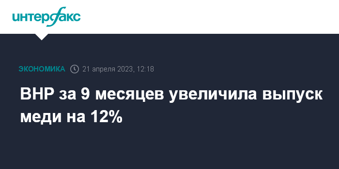 Москва. 21 апреля. INTERFAX.RU - Крупнейшая в мире горнодобывающая компания BHP за 9 месяцев 2023 финансового года (завершились 31 марта 2023 года) нарастила производство меди на 12% по сравнению с аналогичным периодом прошлого фингода, до 1,24 млн тонн, говорится в сообщении компании.