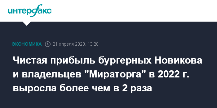 Чистая прибыль бургерных Новикова и владельцев "Мираторга" в 2022 г. выросла более чем в 2 раза