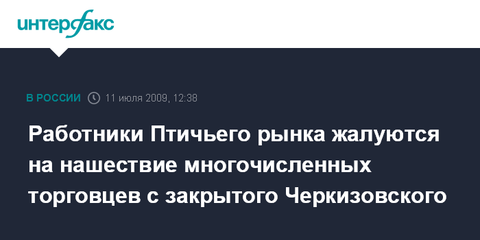 Москва. 11 июля. INTERFAX.RU - Непростая ситуация возникла в связи с событиями на Черкизовском рынке Москвы на рынке на другом конце города - так называемом Птичьем рынке (центр оптово-розничной торговли "Садовод").