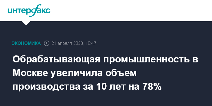 Москва. 21 апреля. INTERFAX.RU - В столице обрабатывающая промышленность за 10 лет увеличила объём производства почти на 80%; выпуск продуктов питания вырос почти в три раза, сообщил мэр Москвы Сергей Собянин.