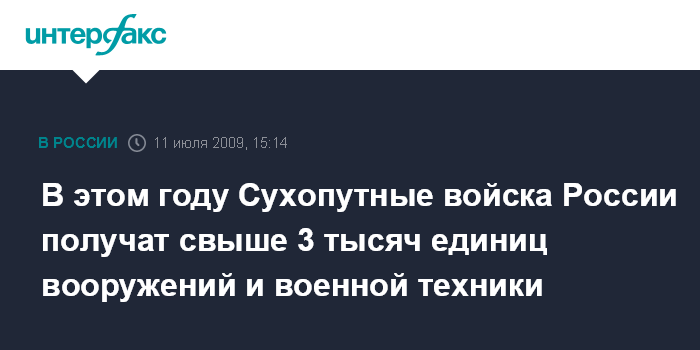 Москва. 11 июля. INTERFAX.RU - Более трех тысяч единиц вооружений и военной техники поступит в сухопутные войска России в 2009 году, заявил первый заместитель начальника Главного штаба Сухопутных войск РФ, генерал-лейтенант Сергей Антонов.