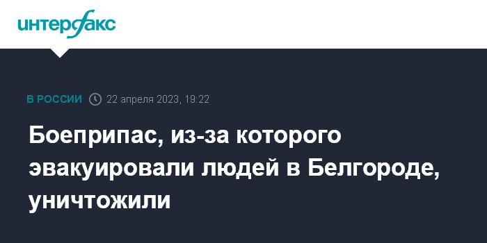 Москва. 22 апреля. INTERFAX.RU - Губернатор Белгородской области Вячеслав Гладков сообщил в своём телеграм-канале о ликвидации взрывоопасного предмета, обнаруженного в центре Белгорода.