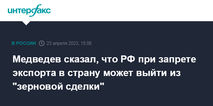Москва. 23 апреля. INTERFAX.RU - Инициатива "Большой семерки" о запрете экспорта товаров в Россию будет иметь зеркальный ответ, в таком случае закончится "зерновая сделка", сообщил замглавы Совбеза РФ Дмитрий Медведев.