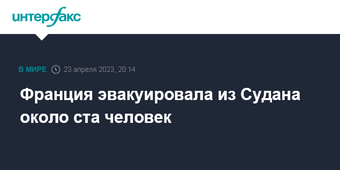 Москва. 23 апреля. INTERFAX.RU - Около 100 человек смогла вывезти в воскресенье из Судана Франция, проводящая операцию по эвакуации находящихся в стране французов и граждан государств-партнеров, сообщил телеканал BFMTV со ссылкой на министерства иностранных дел и вооруженных сил.