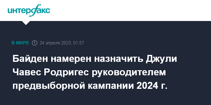 Москва. 24 апреля. INTERFAX.RU - Руководить кампанией по переизбранию президента США Джо Байдена на выборах в 2024 году будет высокопоставленный чиновник Белого дома Джули Чавес Родригес, сообщает CBS News со ссылкой на осведомленные источники.