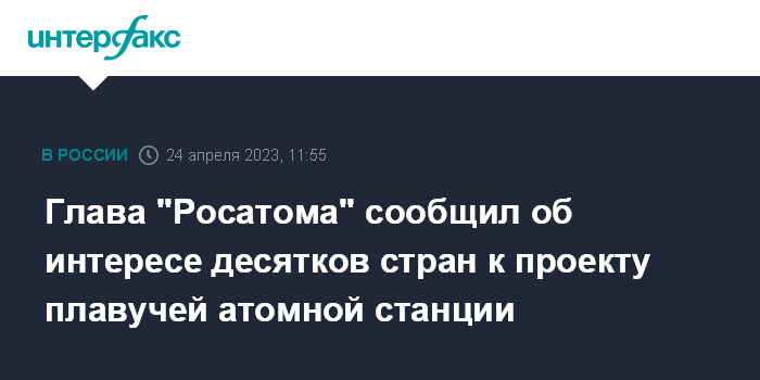 Москва. 24 апреля. INTERFAX.RU - Десятки стран интересуются проектом плавучей атомной станции, сообщил на марафоне общества "Знание" гендиректор ГК "Росатом" Алексей Лихачев.