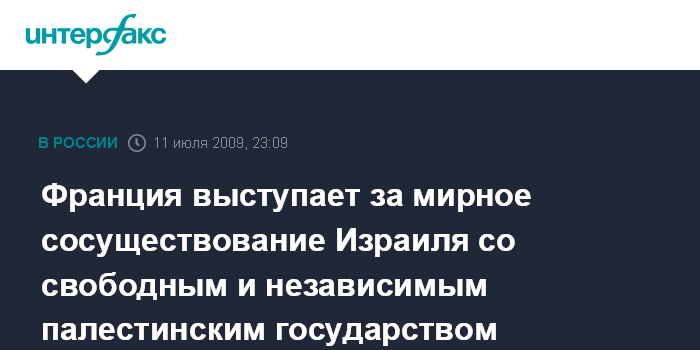 Франция, указал он, "видит единственным решением этого конфликта создание палестинцами свободного и независимого государства, которое будет мирно сосуществовать бок о бок с Израилем".