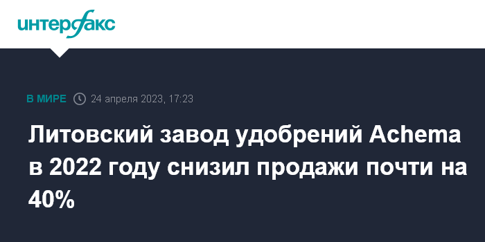 Москва. 24 апреля. INTERFAX.RU - Литовский завод Achema, крупнейший производитель азотных удобрений в странах Балтии, в 2022 году снизил объемы продаж на 37% – до 1,4 млн тонн с 2,22 млн тонн в 2021 году. Об этом сообщило BNS со ссылкой на генерального директора предприятия Рамунаса Миляускаса.