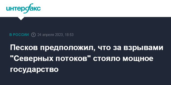 Москва. 24 апреля. INTERFAX.RU - Теракты на газопроводах "Северный поток" не могли быть устроены террористом по примеру персонажа фильмов о Джеймсе Бонде, за взрывами стояло очень мощное государство, заявил пресс-секретарь президента РФ Дмитрий Песков.