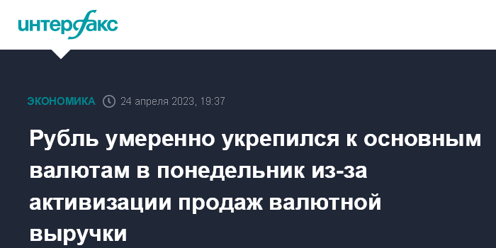 По мнению экспертов "Интерфакс-ЦЭА", рубль умеренно укрепился к основным мировым валютам по итогам торгов 24 апреля благодаря росту предложения иностранной валюты со стороны экспортеров в условиях приближающегося налогового периода апреля. Кроме того, поддержку нацвалюте стала оказывать и наметившаяся стабилизация ситуации на мировых нефтяных площадках.