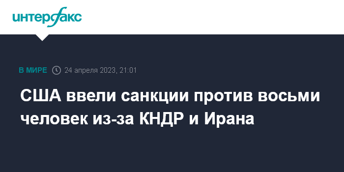 Москва. 24 апреля. INTERFAX.RU - Минфин США в понедельник внес в санкционный список восемь человек - трех из-за связей с КНДР, а также - против пяти иранцев, говорится в заявлении ведомства.