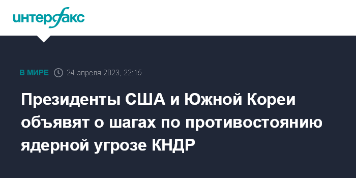 Москва. 24 апреля. INTERFAX.RU - Президенты США и Южной Кореи Джо Байден и Юн Сок Ель во время встречи в среду объявят о мерах по противостоянию северокорейской ядерной угрозе, сообщил в понедельник советник по национальной безопасности президента США Джейк Салливан.