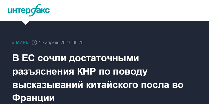"Вчера я опубликовал твит, в котором написал, что надеюсь, что эти заявления посла не представляют собой официальную позицию Китая. И теперь у нас имеется конкретный ответ, что так оно и есть. Словом, хорошая новость", - сказал Боррель в понедельник на пресс-конференции в Люксембурге после заседания Совета Евросоюза по иностранным делам, в ходе которого состоялся обмен мнениями по Китаю глав МИД стран ЕС.