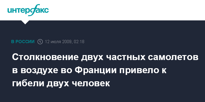 Москва. 12 июля. ИНТЕРФАКС - Два человека погибли при столкновении в субботу двух частных самолетов в департаменте Пюи-де-Дом во Франции, передает в воскресенье телекомпания "Вести".